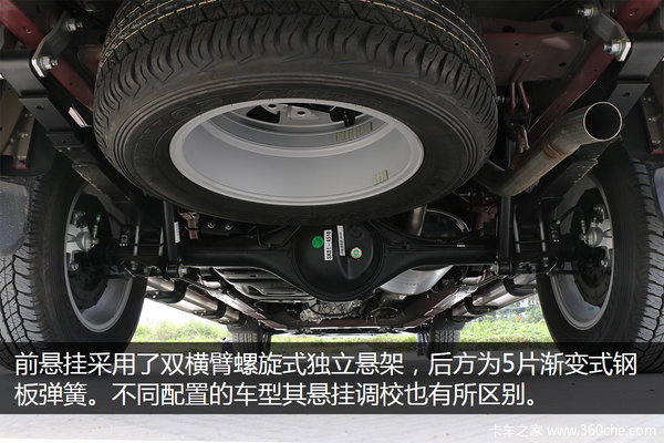 该车前悬挂采用了双横臂螺旋弹簧独立悬架,后方采用了渐变式钢板弹簧非独立悬架,钢板数为5片。据厂商称,不同配置的车型其悬挂调校也有所区别,小排量车型调教偏向舒适度,而大排量车型的调校更强调承载性。