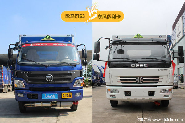 前脸部分,两款车设计偏向圆润,也符合多数国人的审美。不同地方在于东风多利卡D6配备有遮阳罩(在轻卡车型里比较少见),摆臂较长的组合式后视镜也让其更有产品竞争力。