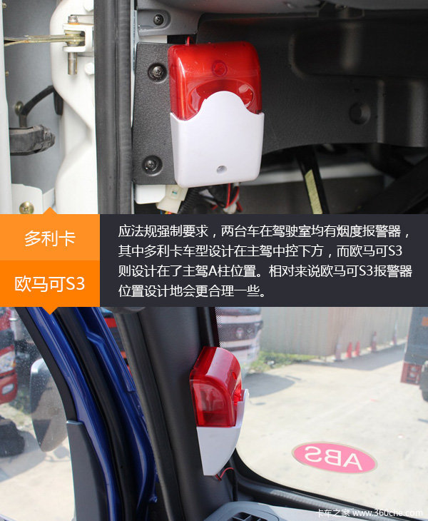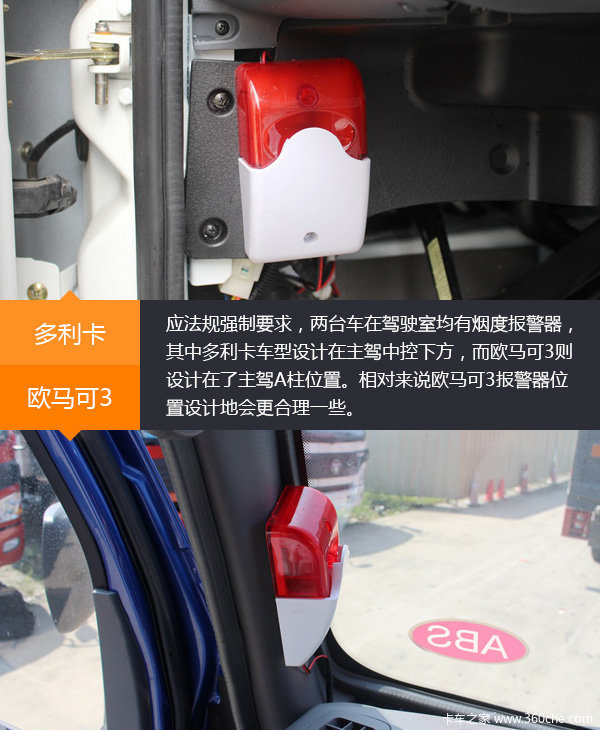 驾驶室烟度报警器,欧马可3设计在驾驶员A柱位置相对更合理一些。当然,报警器在报警时会有灯光闪烁,驾驶员同样能够看到,安全方面并不会有问题。卡友选择自己喜爱的车型就可以了。