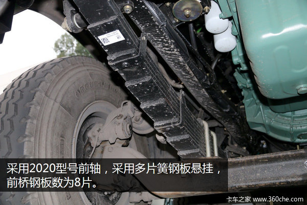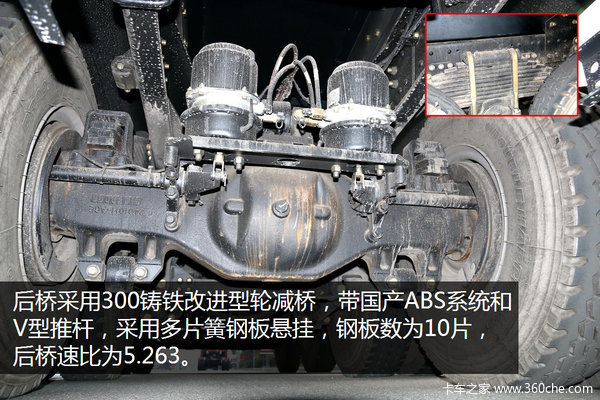 后桥采用300型号铸钢改进型轮减桥,带有国产ABS系统和V型推杆,以保证车辆刹车及正常行驶时的安全性。后桥采用双后桥车型普遍采用的多片簧钢板悬架,钢板数为10片。后桥速比为5.263,典型的工程车型后桥速比。
