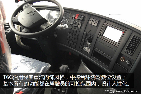 在内饰布局方面T6G也没有进行太大改变,沿用经典重汽内饰风格。中控台环绕驾驶位设置,基本所有的功能都在驾驶员的可控范围内,设计人性化。