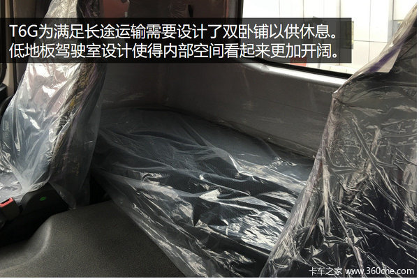 T6G定位干线运输市场,为满足双人驾驶需要设计了双卧铺以供休息。V型驾驶室设计使得内部空间看起来更加开阔,两个人日常驾驶生活需求都可满足。