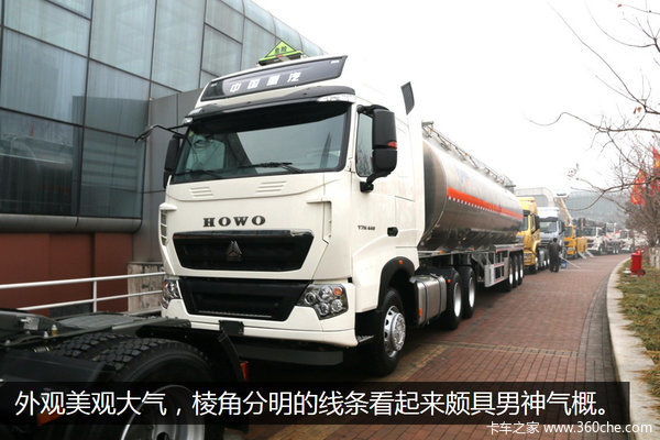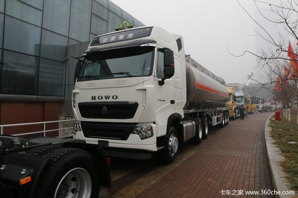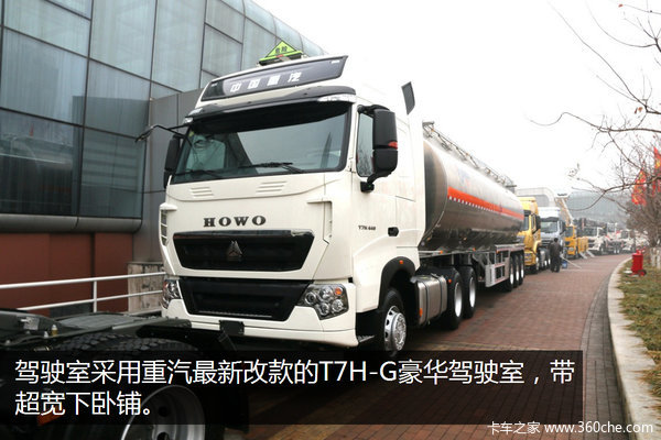 来卡车之家App【卡车之家 原创】2017年重汽商务大会上,豪沃T7H带来了全场唯一一款危险品运输牵引车。这款车型称为B版T7H干线之星。它是由重汽全面引进曼公司整车技术,为危化品行业及标载干线物流运输的货物较轻的工况,专项定制的T7H/6x4危险品牵引车。该车采用的是B版牵引车头,来实现轻量化减重。其后面的半挂也使用了大量的铝合金部件,以此达到降低车辆自重,提高运输力的目的。