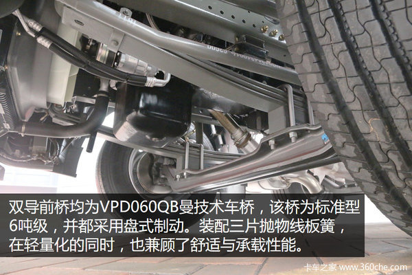 为轿运车量身定制的低顶驾驶室,双导前三片后气囊的悬架方式,以及小轮胎的应用,可以看出重汽在中置轴轿运车方面还是下了很大的功夫。