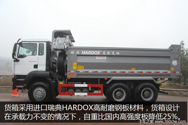 货箱采用进口瑞典HARDOX高耐磨钢板材料、全密闭式爱尔兰结构,满足城市最严环保要求,并且货箱设计在承载力不变的情况下,自重比国内的高强板货厢轻20%以上,上装自重4.8吨,针对国内市场,可以装载更多的货物。
