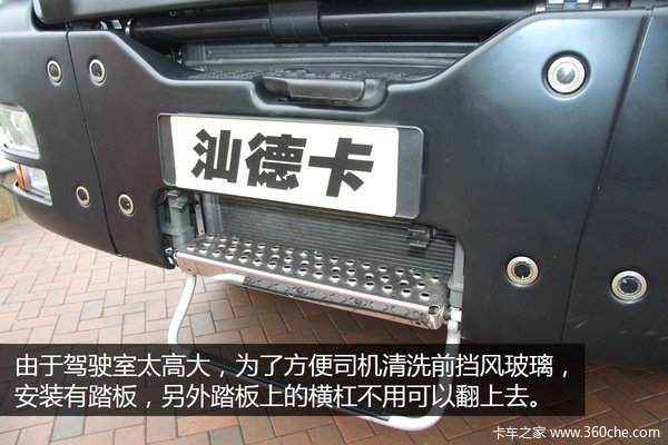 由于驾驶室太高大,为了方便司机清洗前挡风玻璃,在汕德卡的牌子下面安装有踏板,另外第一层踏板需要的时候放下来,不用可以收回去,非常方便,丝毫不影响整体美观。