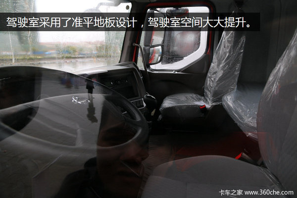 由于车门处于锁闭状态,所以现场记者没能进入驾驶室。透过玻璃窗可以看到该车采用了全新中控设计,配备了皮质方向盘、半平地板驾驶室、向前延伸的卧铺垫,驾乘舒适性会有不错表现。