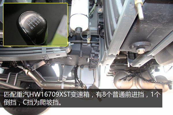 9挡箱带爬坡挡:带匹配重汽HW16709XST 9挡变速箱,C挡为爬坡挡,在车辆重载或爬大坡时,使用C挡起步更容易。