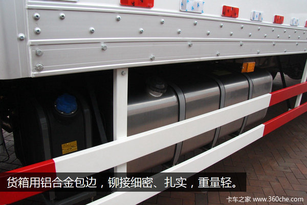 500L铝合金油箱:货箱左侧有一个500L铝合金油箱,铝合金材质的应用能减轻车身重量,符合当下卡车轻量化设计趋势。