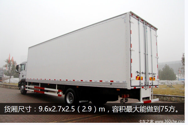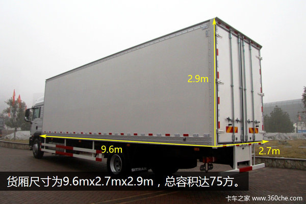重汽推出的这款汕德卡大单桥车型,货厢尺寸为9.6x2.7x2.5(2.9)m,容积最大能做到75方。