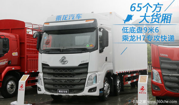 东风柳汽年会上展出的一台低底盘乘龙H7,货厢长9.8米,容量高达65立方米。