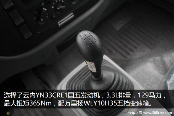 为了让车辆在重载时能有足够的爬坡能力,这款豪曼地下室专用车型选择了云内YN33CRE1发动机,3.3L排量,最高转速可达到3200转,最大功率129马力,最大扭矩365Nm,匹配万里扬WLY10H35五档变速箱。