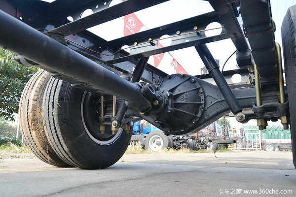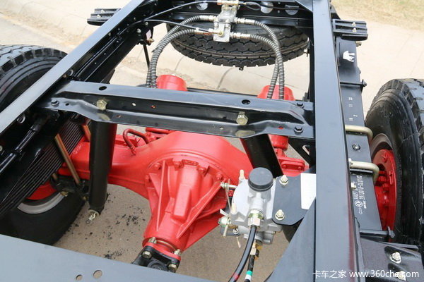 两种吨位的后桥采用相同的主减总成,但是桥壳和轮毂单元略有区别,5.0吨级的德纳红桥采用“大六孔”轮毂,螺栓分布圆直径为222.25mm,装配康三款多利卡钢圈。