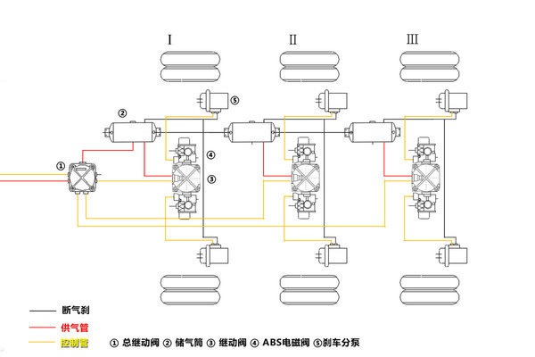 再来看看六通道ABS,每个车桥都由一个单独的控制单元控制,包含一个继动阀和两个用来控制两组车轮的电磁阀组成。此外,六通道ABS的储气筒也增加到三个。所以,不难看出,与四通道ABS相比,六通道ABS对车轮的监测及控制更加精准。