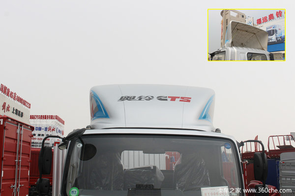 奥铃CTS的新款导流罩也跟随驾驶室外形同步做了变化,驾驶室顶部前端的两个示廓灯依然还在,导流罩不在为示廓灯而故意内陷。全新的导流罩增加了侧部扰流面积和印花图案,使整体看起来不仅更加美观造型也更为协调。并且从后面可以看出该导流罩体积还是很大的,内部有多处用于加强的支撑结构。