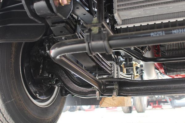 前桥为3片变截面板簧,保持承载力、舒适性以及降低车身高度,后桥板簧为加厚型8+6片,更注重承载能力。后桥速比为5.375,标配断气刹、ABS、也同样配有横向稳定杆。