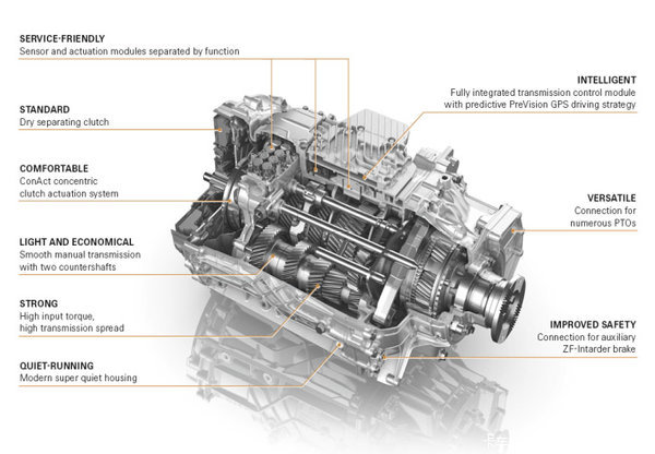 TraXon变速器换挡畅顺,行车质感良好,得益于离合器及换挡部件的优化,还有不断改进而来的换挡控制程序。除此以外,采埃孚还增加了可选装的PreVision GPS(可理解为“预知性GPS换挡功能”),来使变速器的自动换挡更优。