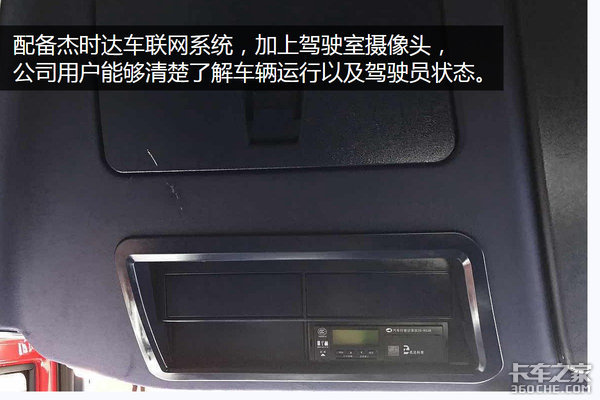 智能化方面配备电动后视镜加热,远程电加热供油系统开关,杰时达车联网豪华版系统,车辆巡航,导航大屏。