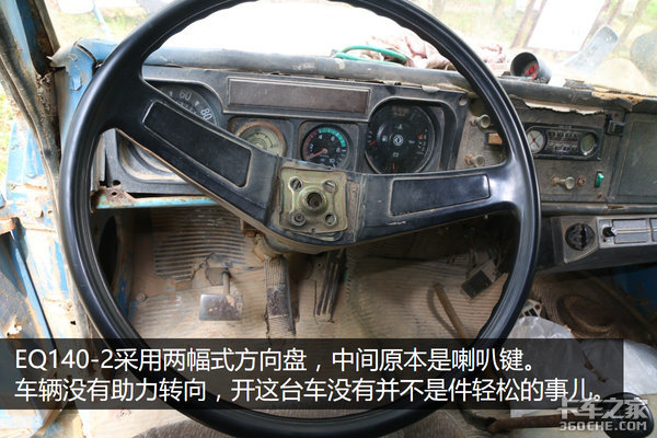 EQ140-2采用两幅式方向盘。由于没有助力转向,开这台车没有并不是件轻松的事儿。虽然这款车广泛用于驾校,不过与满载时相比还是有一定差距的,驾驶过的卡友都应该有深刻体会。