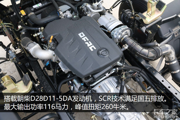 这款发动机采用博世SCR后处理技术达到国五排放标准。最大输出功率为110马力,峰值扭矩为280牛米,能够满足短途城际配货使用,与发动机匹配的则是格特拉克五挡变速箱。
