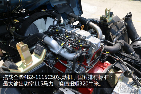 动力部分,这台车首次搭载全柴4B2-1115C50发动机。是D6首次搭载全柴引擎,4缸结构,排量为2.5升,最大输出功率115马力,峰值扭矩320牛米,是主流的动力大小,能够满足中短途运输使用。在排放方面则采用博世高压共轨与SCR后处理技术达到国五排放。与发动机匹配的则是万里扬变速箱。