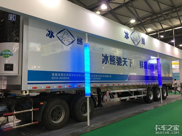 来卡车之家App【卡车之家 原创】2017年5月17-19日,“亚洲生鲜荟”在上海新国际博览中心重磅上演。在现场众多参展商中,自然少不了冷链装备的生产企业,其中河南冰熊的展台上就展出了三款产品,下面要介绍的就是一款又冰熊生产的CDK智能控制半挂冷藏车。这款半挂冷藏车外尺寸为13580x2600x4000mm,厢体容积为81.8方,整备质量8900kg,价格在40万左右。