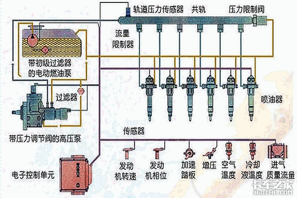 高压共轨全称叫做电控高压共轨,简单的说就是由一个油泵产生高压柴油,再将高压柴油储存倒共轨管里,由ECU根据各传感器的数据计算出最佳喷油正时和喷油量,再由电控的喷油器喷入汽缸进行燃烧。它的最大特点是产生压力和喷入汽缸的过程完全分开,这样的好处是能保证每个喷油器的喷射压力一致,并且可以做到多次喷射,使燃烧更完全排放更佳。