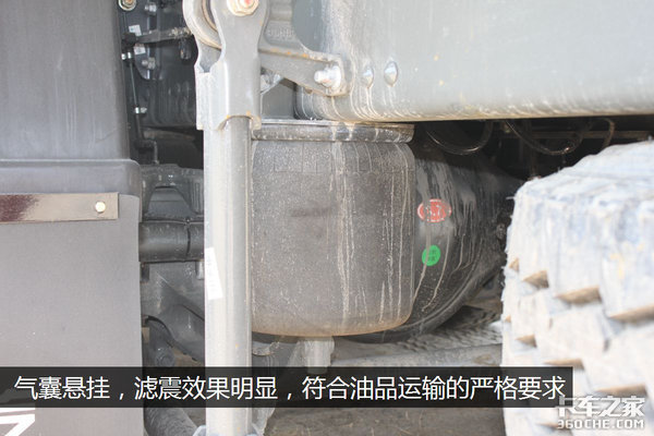 底盘采用MC07 340马力发动机,重汽10挡变速箱,3.7速比单级减速后桥,这样的配置完全满足该车的运输需求。底盘导向轮盘式刹车保证了制动性能,三片弓板的应用既减轻了自重又提高了行车的舒适性;后桥气囊悬挂的应用有效过滤地面的颠簸,提高罐内运送油料液面的稳定,也能在新政下多载重一吨。MCY11鼓式双联桥的应用,其承载能力要比市面上常见的153桥高2吨,但自重较153桥轻200kg,空气悬架采用的ContiTech空气弹簧总成,工作温度为-40℃至70℃,爆破压力可达28bar,性能非常稳定。