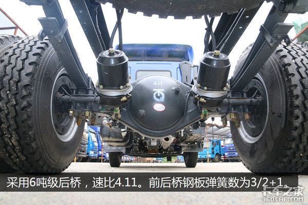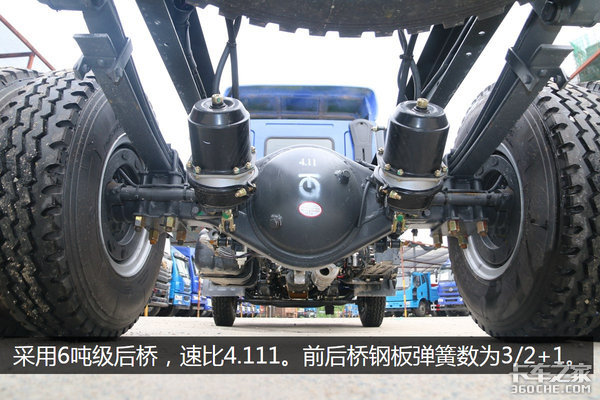 采用6吨级后桥,速比4.11。前后桥钢板弹簧数为3/3片。采用下置式副板簧,目的是为了轻载时保证舒适性,重载时保证承载。