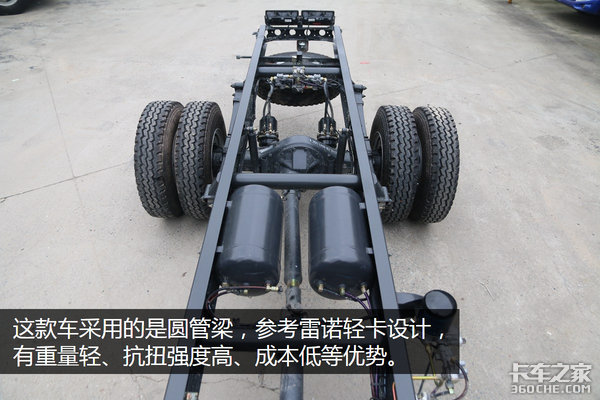 这台车采用的是190mm单层大梁,承载性能中规中矩,能够满足大部分用户使用。据厂家表示,这款车的圆管梁是参考雷诺卡车的设计方法,具有成本低,抗扭强度高等特点。