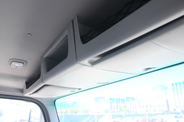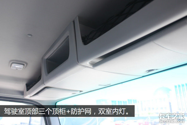 3个顶柜,双遮阳板,双室内灯,小倾角A柱的驾驶室顶棚前部可利用空间优势明显。