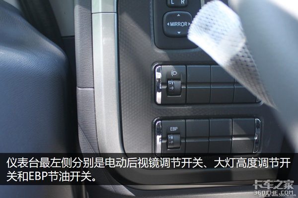 后视镜角度电动调节是一个用了就上瘾的配置,经常一个人驾驶的中卡、轻卡等车型用处更大;灯光高度电动调节方便空载和满载都找到一个合适的灯光照射范围,EBP节油开关更适合那些脚沉的卡友在空载时降低燃油消耗。