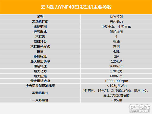 YNF40E1同样是云内动力德威系列发动机,是采用德国FEV尖端技术设计、开发,扭矩储备大,最高转速可达到2600转,功率从95-125KW分四个功率段,扭矩从400-600牛米,最大扭矩区间1300-2200rpm,领先同类产品5%以上,适配中卡、轻卡、客车等商用车。