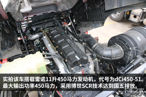动力方面,实拍该车搭载的是东风11升450马力发动机,代号为dCi450-51,这台机器的最大功率由420提升至450,扭矩达2100牛米。采用博世SCR处理技术达到国五排放。