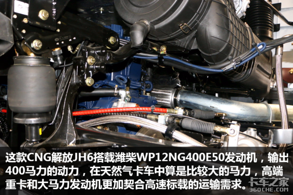 底盘点评:相比较柴油JH6,驾驶室后方与车架左侧的CNG气瓶或许是它最大的不同了,潍柴400马力的气体发动机搭配12挡变速箱和小速比457冲焊桥,在1300转的转速下,车速能够达到80公里以上。这款车总共有8个212升和4个120升的CNG气瓶,总共能够储气2176升,能够续航1000公里左右,满足绝大部分用户的需求。