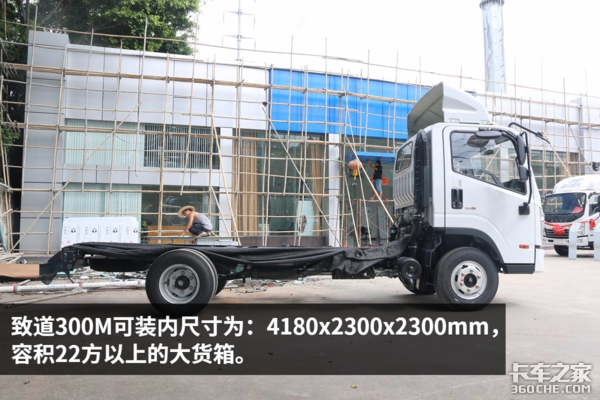 致道300M为中体驾驶室,宽体驾驶室也会于近期上市,满足宽体驾驶室需求的用户。致道300M目前提供单排/排半驾驶室,整车尺寸为:5995x2400x3390,而单排驾驶室车型可装内宽达2300mm的货箱,整个货箱的内尺寸为:4180x2300x2300mm,容积可达22方以上。
