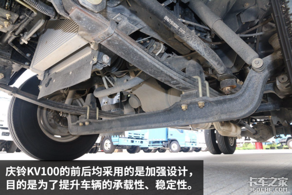 板簧和轮胎规格都很标准,加强的前后桥更多的是为了车辆的稳定性,由此也不难看出KV100是为标载用户而设计的,在保证车辆性能的同时把车辆的运营成本尽力降至最低,才是庆铃的目的所在。