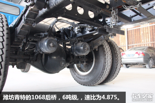 虎V的车桥是出自潍坊青特的产品,标载版使用1058后桥(5吨级),而这台重载版则是1068后桥(6吨级)。除此我还了解到,虎V重载产品还有1080后桥(8吨级)可选,配合大车架、多片板簧的结构,以及选用8.25轮胎,强悍的载重能力可想而知。