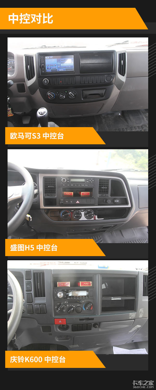 首先,在造型上欧马可和庆铃的中控台都采用了平直的外形,对驾乘空间的影响较小,而盛图H5采用了向驾驶员方向倾斜的设计,视觉效果不错。