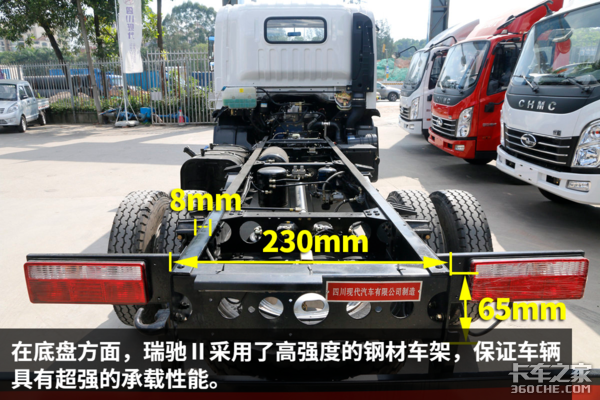 多拉快跑,瑞驰Ⅱ轻卡靠的不仅仅是动力强劲的云内动力,实在的底盘配置也非常重要,既然瑞驰Ⅱ轻卡面向的是8吨-12吨载重的用户,那么像高强度车架、8.25轮胎以及大吨位后桥就显得必不可少。