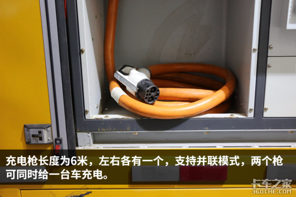 在给其他车充电时,这台补电车的左右两侧各搭载一个长度为6米的直流充电枪,由深圳快充王所提供,充电电流为国标250A。充电枪支持并联模式,两个枪可同时给一台车充电。