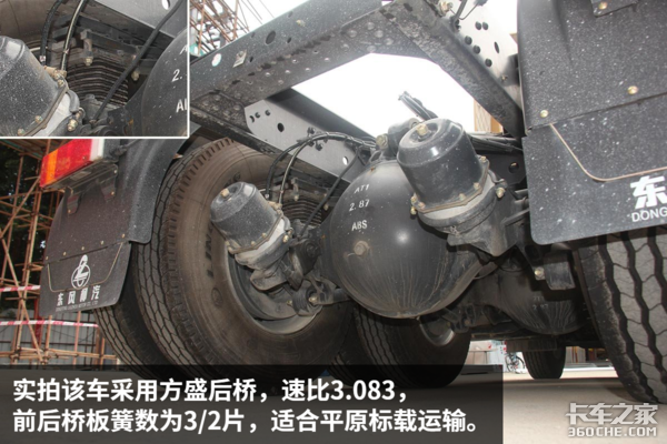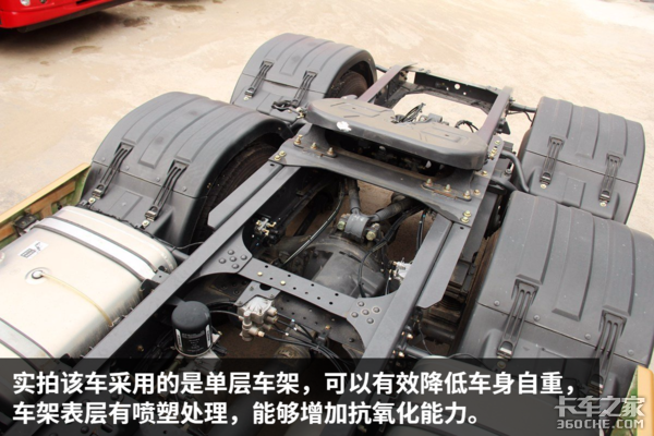 少片簧、单层车架,这也就是我们常说的乘龙H7标载版,板簧下方设有橡胶垫片,目的是为了把底盘增至标准高度,同时增加底盘滤震性能。