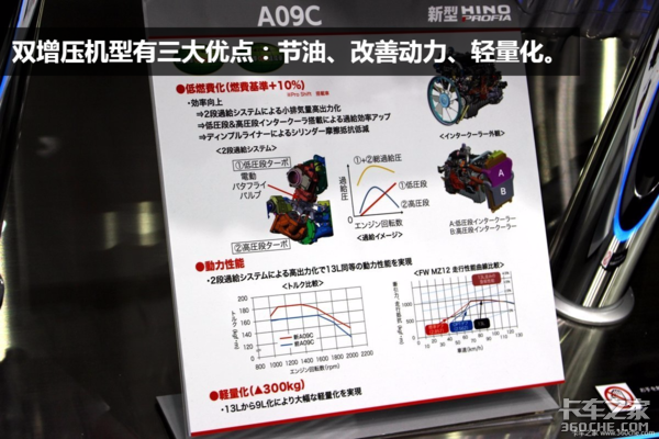 来卡车之家App【卡车之家 原创】在东京车展的日野展台,我们看见了重点推介的两款双增压机型:A09C和A05C。日野柴油机很早就在中国实现了本土化生产,日系柴油机的NVH性能和经济性让人印象深刻。对比上海日野国产的J08E和J05E这样的单增压机型和国内的其他双增压机型,卡友们能看出柴油机的一类发展趋势,在将来选车的时候可以作个参考。