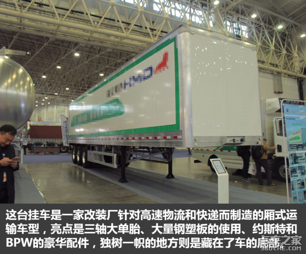 来卡车之家App【卡车之家 原创】本次在武汉举办的中国国际商用车展览会可谓亮点多多,多家企业在现场实力秀了一波肌肉。在上装和专用车展览区,有一家挂车厂带来的厢式运输挂车可谓有“性格”——“没有”纵梁,三桥均配备大单胎,还有名牌加持,到底咋回事?一起去看看,走你~