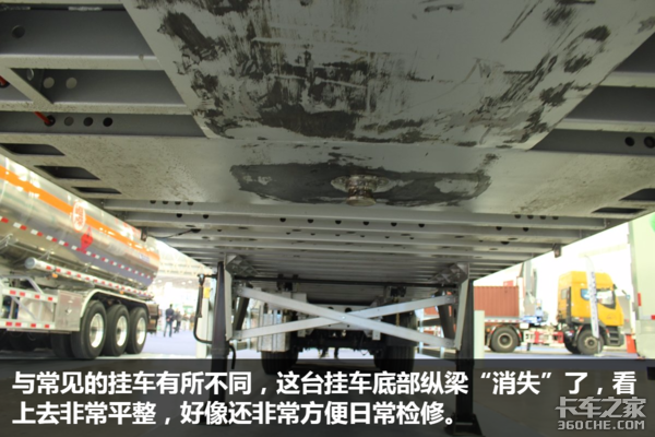 据厂家人员介绍,原来,这台挂车的纵梁没有消失,而是采用了内置的形式,这种设计没有损失有效容积,也看起来非常美观。