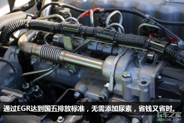 另外,这款发动机采用EGR来达到国五排放标准,无需添加尿素,好处是节省了尿素采购成本,同时也省去了因加注尿素而带来的时间损耗。