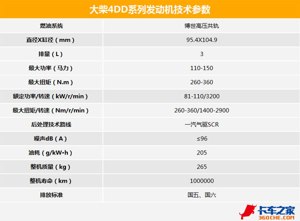 道依茨一汽大柴4DD国五系列发动机 的排量为3升,是全新品台的产品,缸径和行程为95.4×104.9毫米,该系列产品有110-150马力段三种机型可选,扭矩范围为260-360牛米,用户可以根据自身的使用需求,选择相应动力的车型。