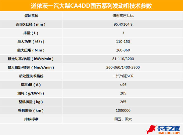 道依茨一汽大柴4DD系列发动机具备德国同级别产品同步动力科技,拥有品质可靠,省油强劲,安静舒适,超长使用寿命,超低的维护费用等特点。目前主要搭载解放J6家族轻卡车型,并且被广大用户称之为轻卡金牌动力。凭借独有的先进技术,已成功占领了国内高端轻卡动力领域。(文/董鑫焱)