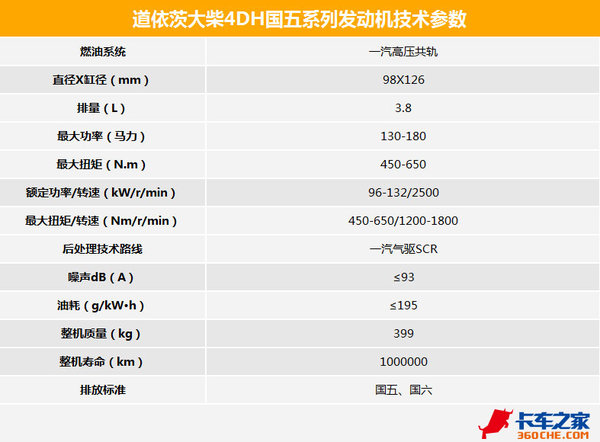 道依茨一汽大柴4DH系列发动机排量为3.8升,是国五及未来国六轻、中卡的核心动力,目前已经大量匹配与一汽解放J6L、J6F和青岛解放的龙V、麟V等车型。缸径和行程为98×126毫米,该系列产品有130-180马力段四种机型可选,扭矩范围为450-650牛顿·米(N·m),用户可以根据自身的使用需求,选择相应动力的车型。