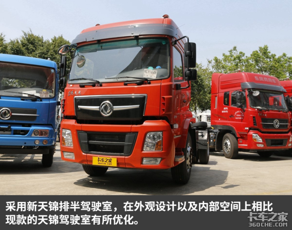 这款东风天龙采用的是新款天锦驾驶室,在外观方面与现款天锦牵引车并无太大区别,主要是细节上进行了优化,譬如在保险杠上设置了蹬车踏板、车顶加入遮阳板以及优化了轮眉设计。